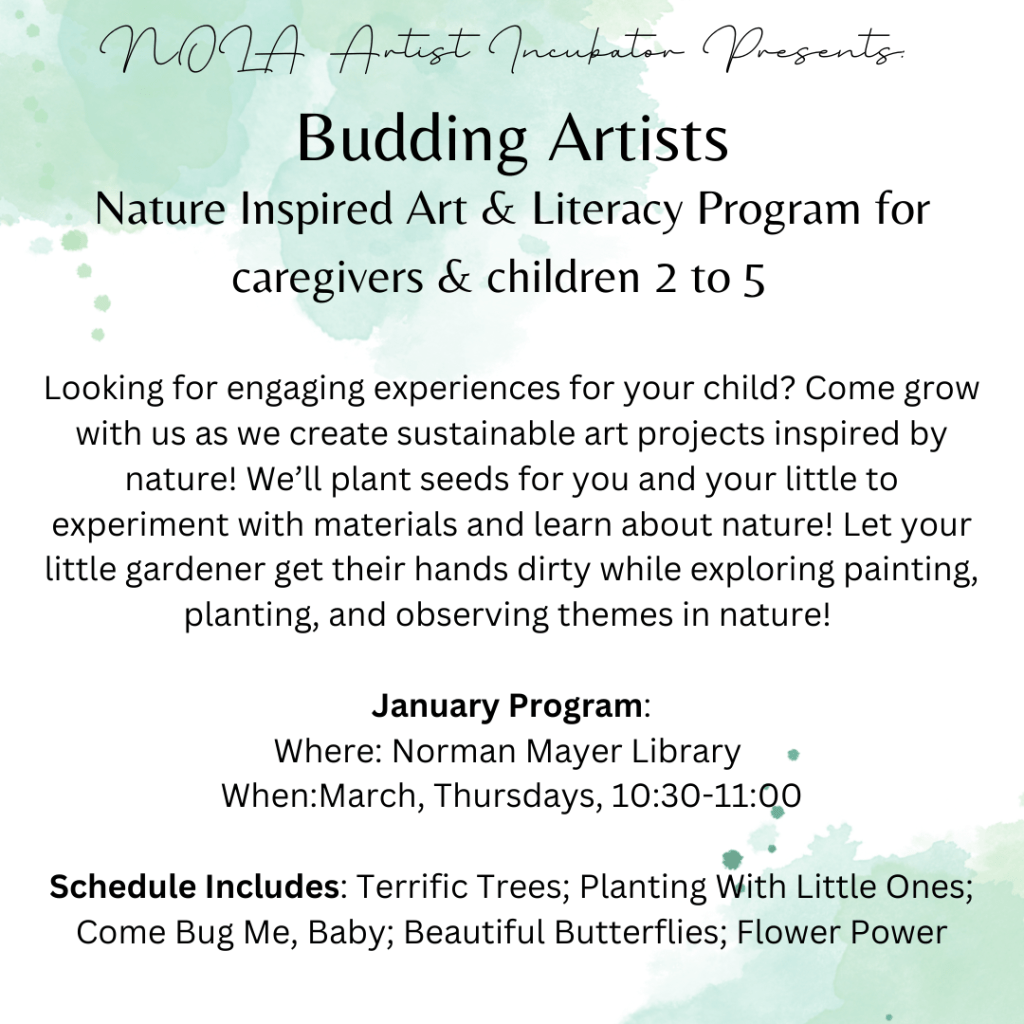 This March the NOLA Artist Incubator will be offering free educational programming at the Norman Mayer Library Branch. Throughout the month of March, caregivers and children 2-5 can sign up to participate in Budding Artists workshops at the library.