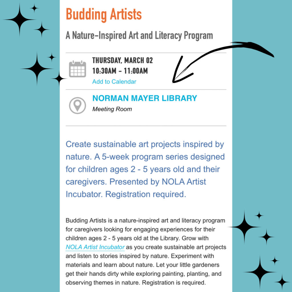 We’re pleased to inform you that registration for Budding Artists is open! Our 5-week program series designed for children ages 2 – 5 years old and their caregivers starts March 2nd. We welcome community members to join us and create sustainable art projects inspired by nature at the Norman Mayer Library.