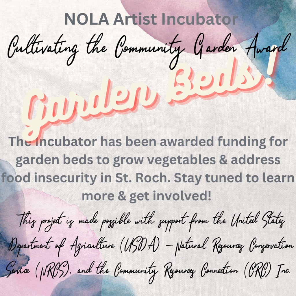 The Community Resources Connection, Inc. 2022-2023 Community Garden Award has been announced. NOLA Artist Incubator was among six applicants from Louisiana and South Carolina selected as awardees. Cultivating the Community Garden Award aims to assist organizations purchasing garden supplies to increase availability of fresh fruits and vegetables within underserved communities. With shared goals to increase access to local fresh healthy foods and food choices within food insecure communities, we are elated to have been given the opportunity to transform the Galvez Garden and have funding for tools to provide organically grown produce to the St. Roch community.