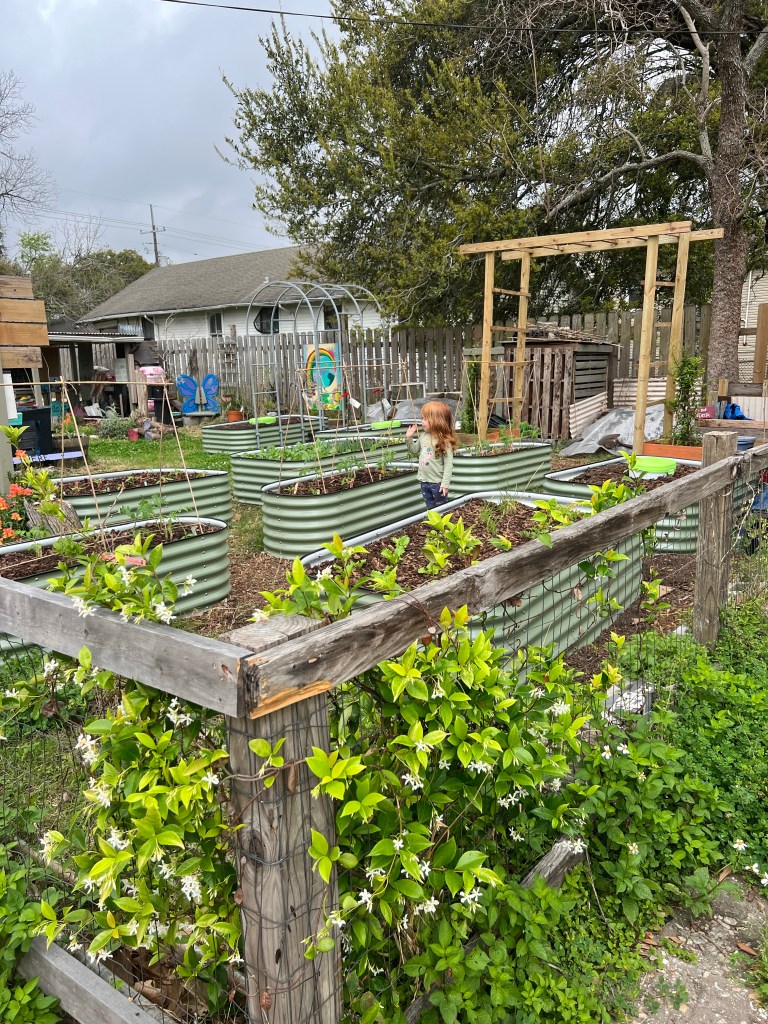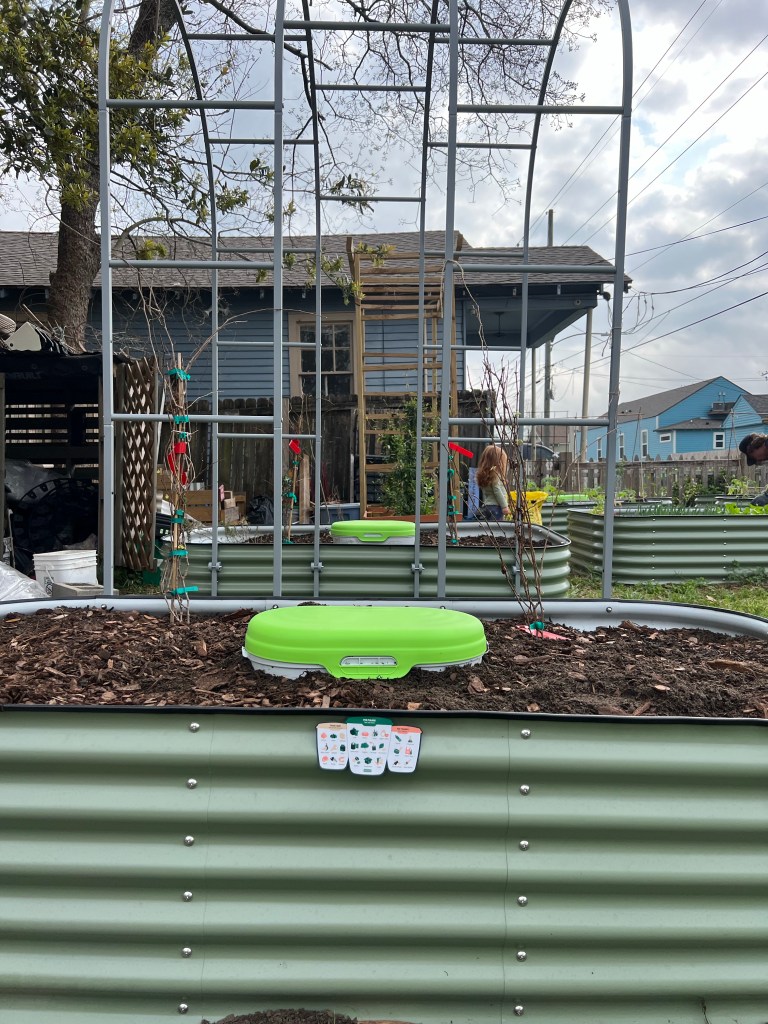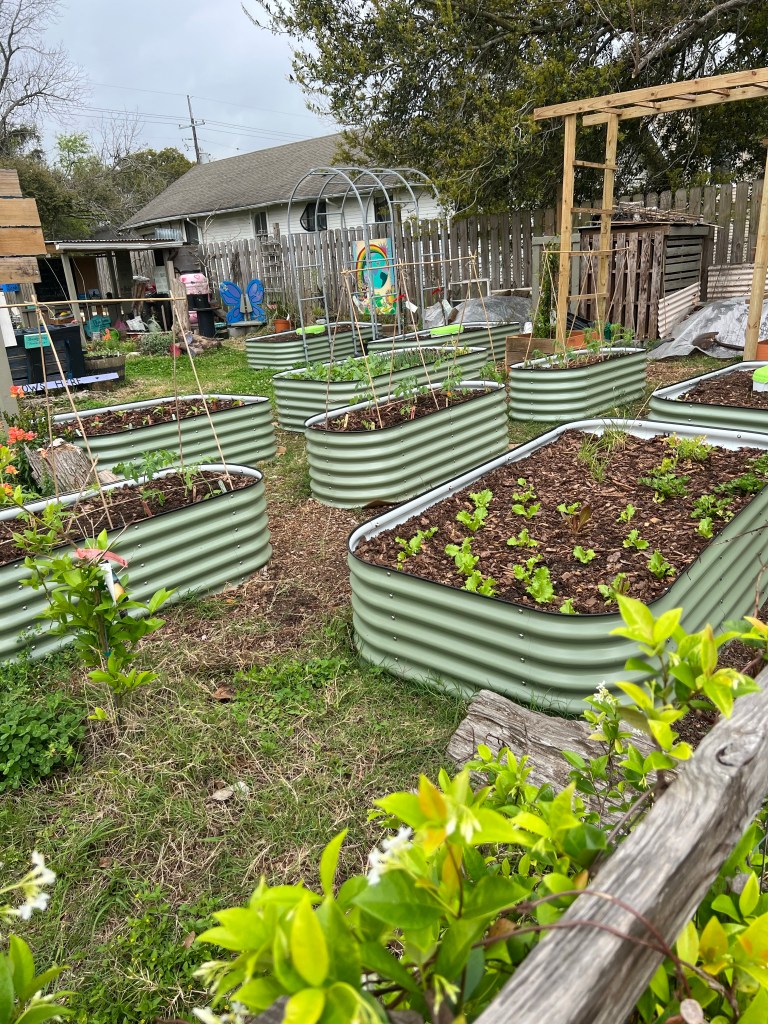 A total of nine beds have been assembled and placed in the garden. Currently we have planted seeds of corn, sunflowers and squash in the large bed at the back of the property (in consideration of sunlight and the shade they will cast when they grow). We have planted multiple tomato varieties in the three slimmer beds in the center and plan to add marigolds and basil as companion plants soon. One large bed at the entrance has been planted solely of pepper varieties, per community feedback and at the request of neighbors. In our other beds in the garden we have planted green onions, lettuce, turnips, lovage, chives, and celery.