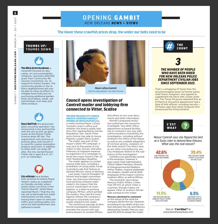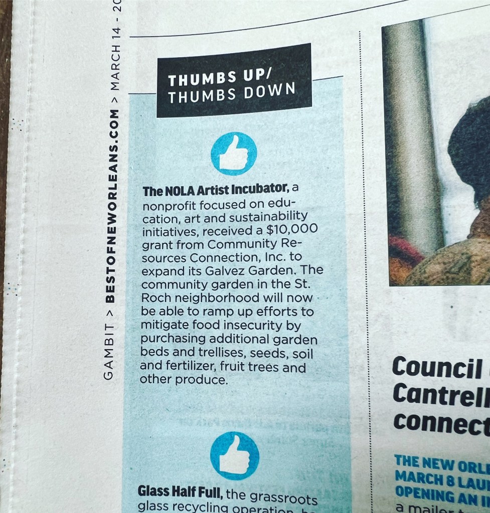 We’re delighted to report that the Incubator has been recognized in our local paper! Alongside Glass Half Full, the NOLA Artist Incubator received a “Thumbs Up” from the Gambit this week! Thanks for the shout out!