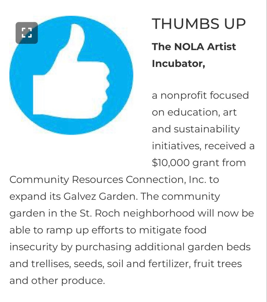 a nonprofit focused on education, art and sustainability initiatives, received a $10,000 grant from Community Resources Connection, Inc. to expand its Galvez Garden. The community garden in the St. Roch neighborhood will now be able to ramp up efforts to mitigate food insecurity by purchasing additional garden beds and trellises, seeds, soil and fertilizer, fruit trees and other produce.