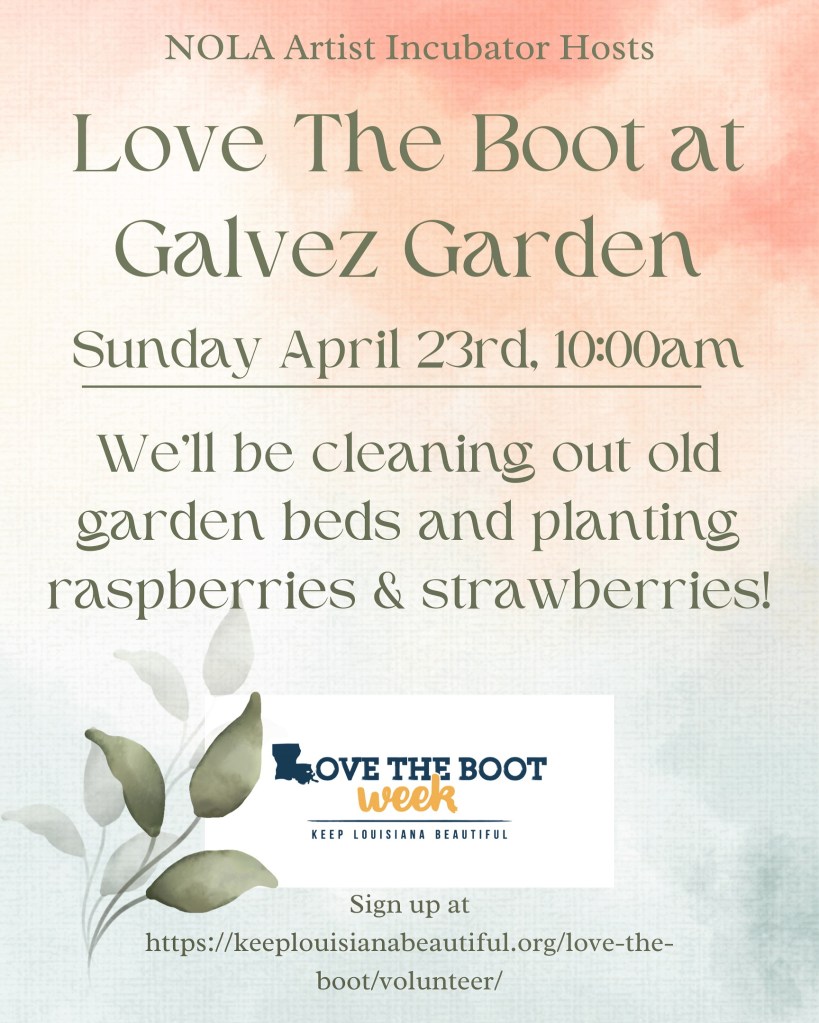We’ll be planting strawberries and raspberries and look forward to seeing you at the beautification event! Also, for our Budding Artists families that attended 2 or more of our workshops last month, we’ll be distributing Jazz and Heritage Festival tickets from 10:00-11:00. See you there!