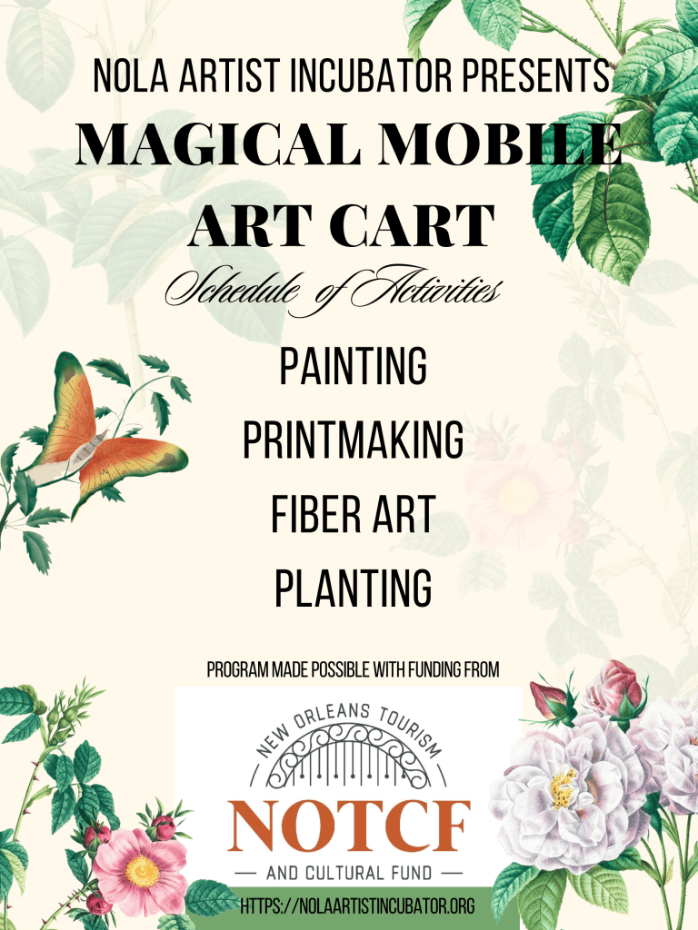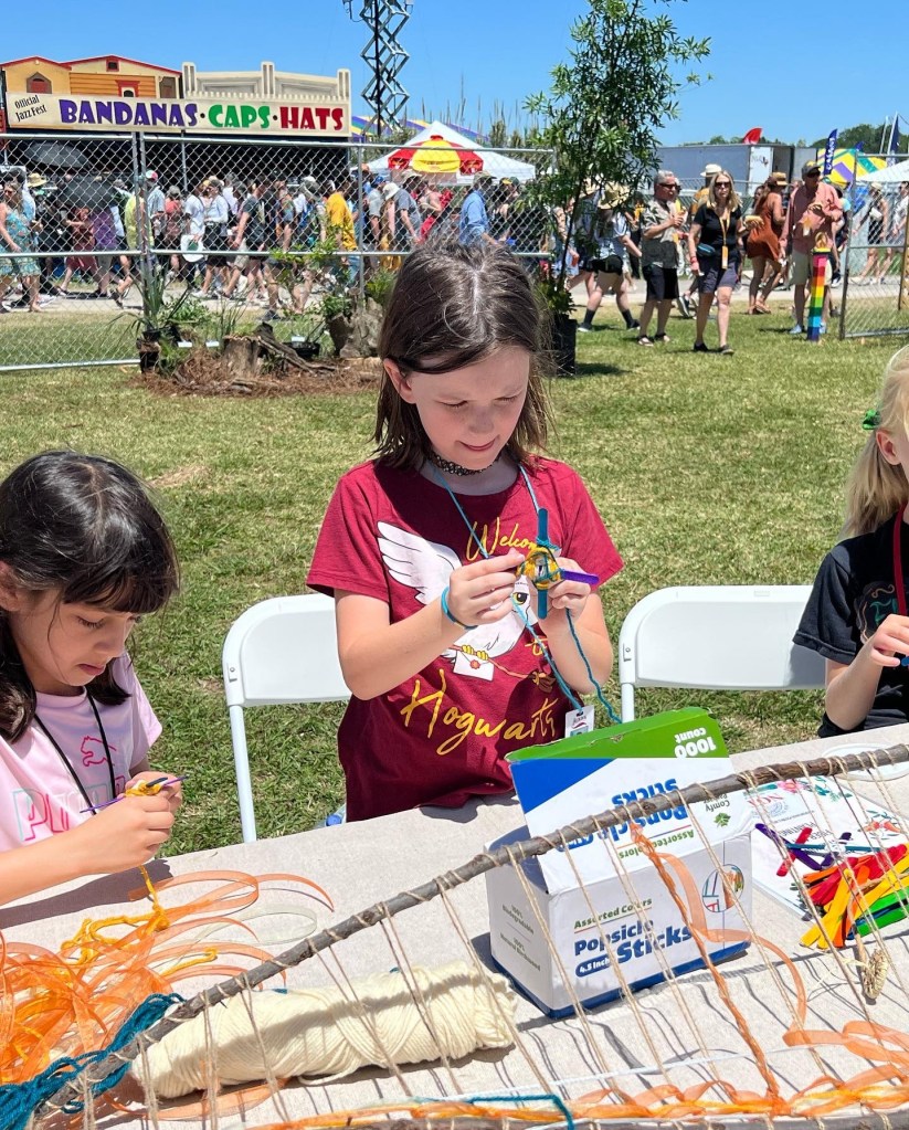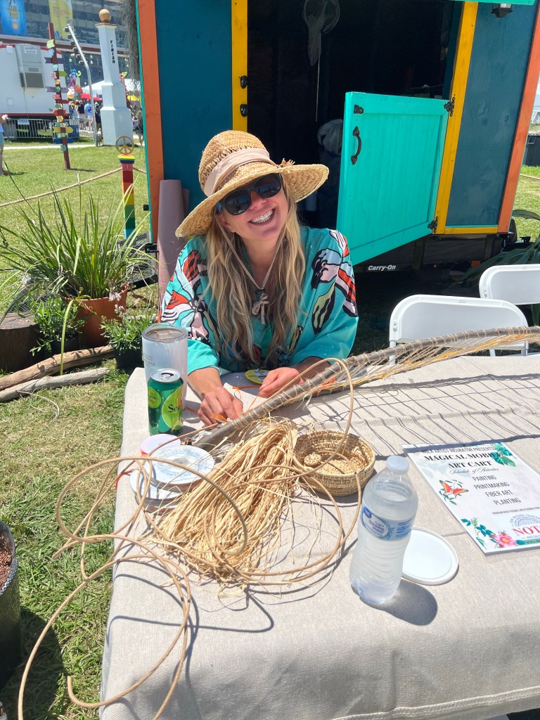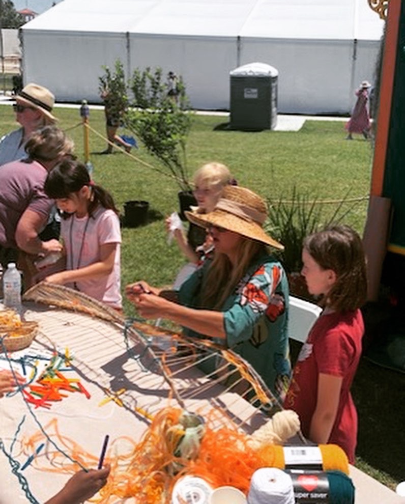 The Magical Mobile Art Cart is a hit and doing its job of delivering the joy of making and gardening to the public. Today we set up tables and chairs to facilitate planting and weaving activities with young festival attendees. We had families from our Budding Artists program pay us a visit and made new friends with young artists and their families throughout the morning.