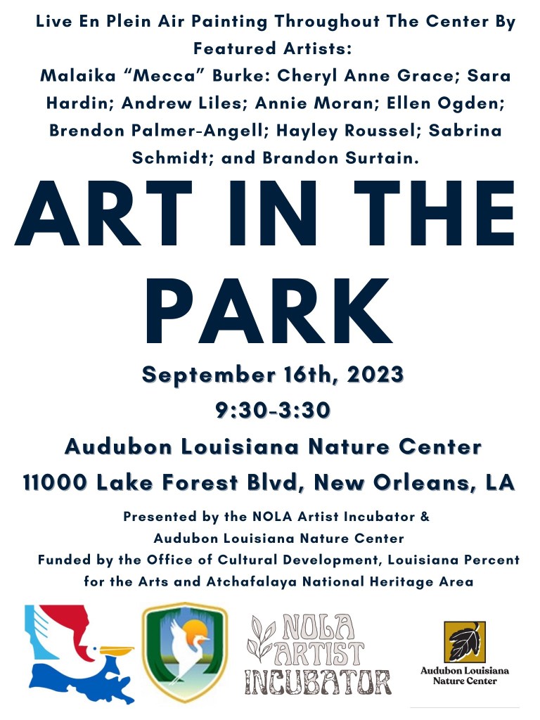 The NOLA Artist Incubator is pleased to promote this years NOLA East Festival! This phenomenal family friendly event is free and open to the public. Including live performances and vendors, this community oriented event starts at 11:00 and goes to 7:00. Located at Joe W. Brown Park, directly next to the Audubon Louisiana Nature Center, we encourage you to come see our artists in the morning for Art in the Park, and stay for the entertainment showcasing New Orleans East food and culture at the festival!