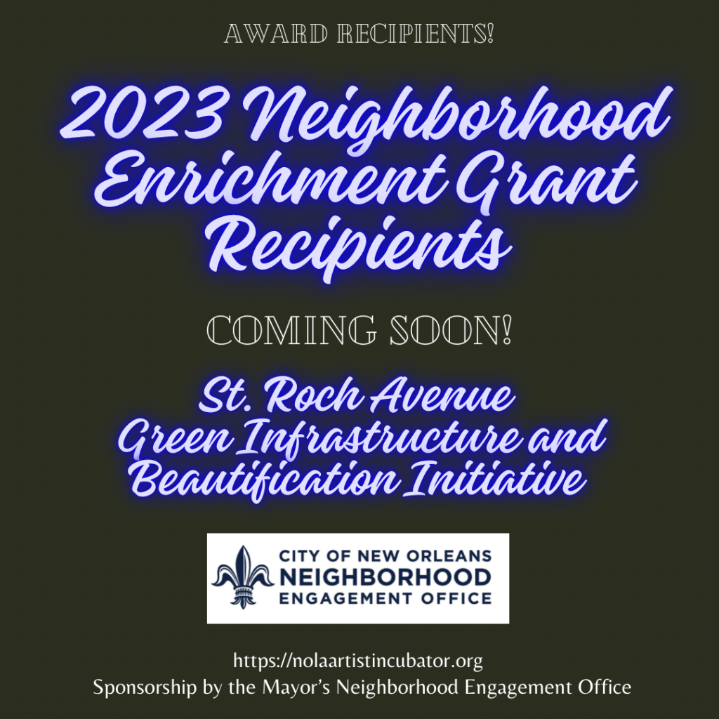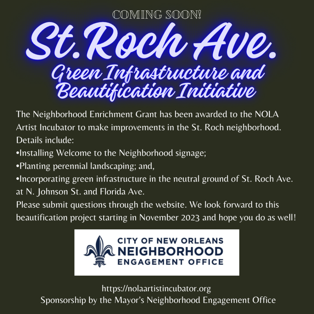 As awardees the NOLA Artist Incubator is charged with creating a Green Infrastructure and Beautification Initiative in the community. Our project is aimed at making improvements along St. Roch Avenue. Specifically we plan to focus on the St. Roch Avenue at North Johnson, and St. Roch Avenue and Florida Avenue intersections. We look forward to beautifying these areas to improve the appearance of the existing neutral ground. Already lined with mature oak trees, we plan to tend to the neutral ground by adding mulch around the trees and planting small gardens around “Welcome to St. Roch” signage. We also aim to incorporate green infrastructure by utilizing rain catchment systems on a roof installation to assist with watering the plants and providing a shaded area on the corridor. Stay tuned for more information and progress!
