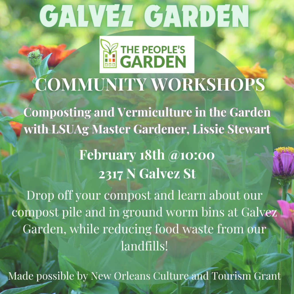 We’re excited to be offering a new workshop each month; thanks to the support of the New Orleans Culture and Recreation Fund. We plan to offer workshops at the Galvez Garden February through May, on Sundays to coincide with our community compost collection day. In Partnership with LSUAg Master Gardeners and as a Master Gardener Project Site, we revel in the opportunity to share our knowledge of gardening with others! It’s our hope that by offering these workshops we can inform more people of the importance of individuals working collectively for the common good. We gathered three bins of food scraps today that will be composted, used to feed our vegetable garden nutrients, and ultimately help in our efforts to sustainably grow food to be shared with community members.