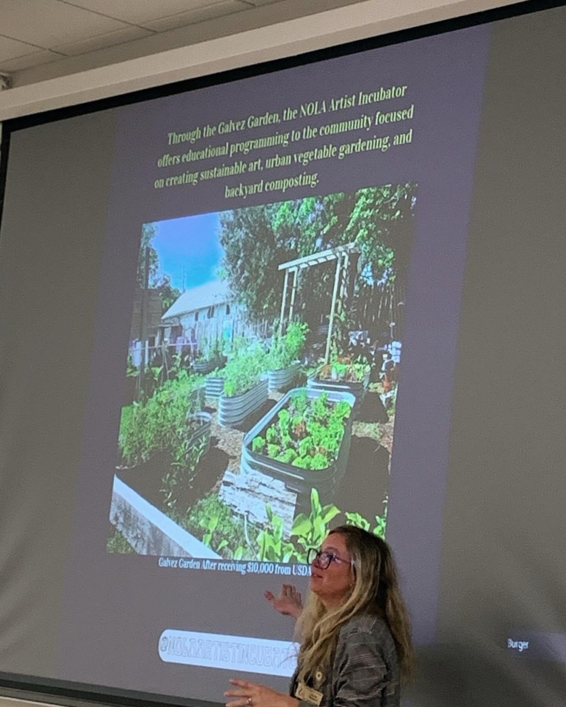 NOLA Artist Incubator brought a unique perspective to the panel, discussing sustainability efforts at the Galvez Garden and showcasing the intersection of sustainability and the arts. Through Lissie’s presentation, she demonstrated how creativity and innovation can be powerful catalysts for social and environmental change. Her presentation not only showcased the power of infusing sustainability into each project of the nonprofit, but also emphasized how being persistent and patient is key, and that it takes time to build a meaningful program and organization.
