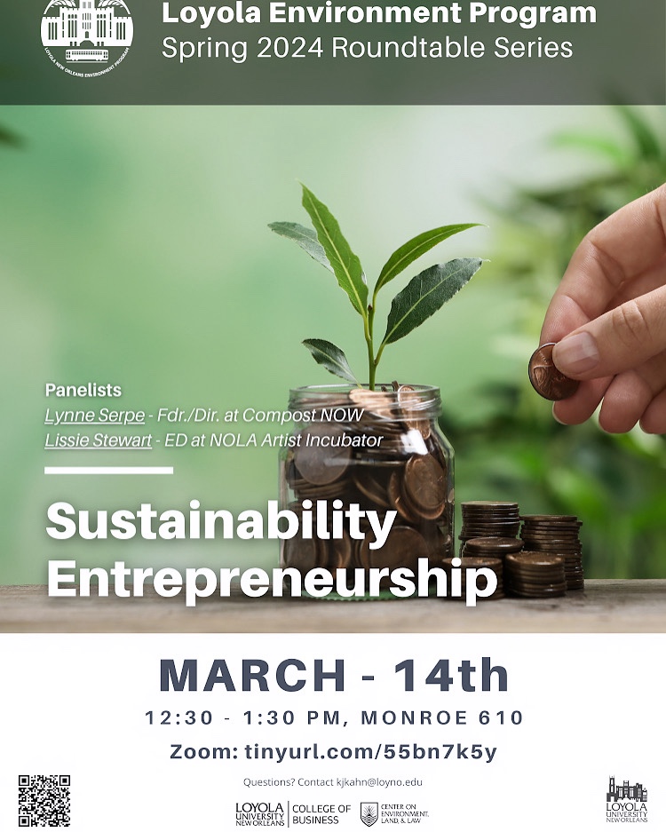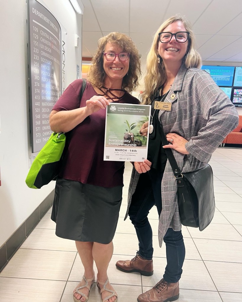 Lynne Serpe, Founder and Director of Compost NOW and Lissie Stewart, Executive Director of the NOLA Artist Incubator recently delivered powerful and meaningful presentations at Loyola’s Environment Program Sustainability Entrepreneurship panel, captivating the audience with their innovative approaches and impactful initiatives.