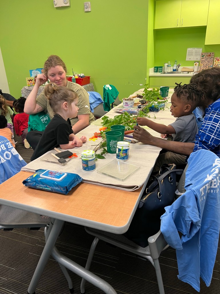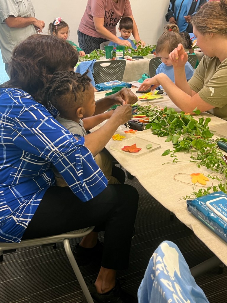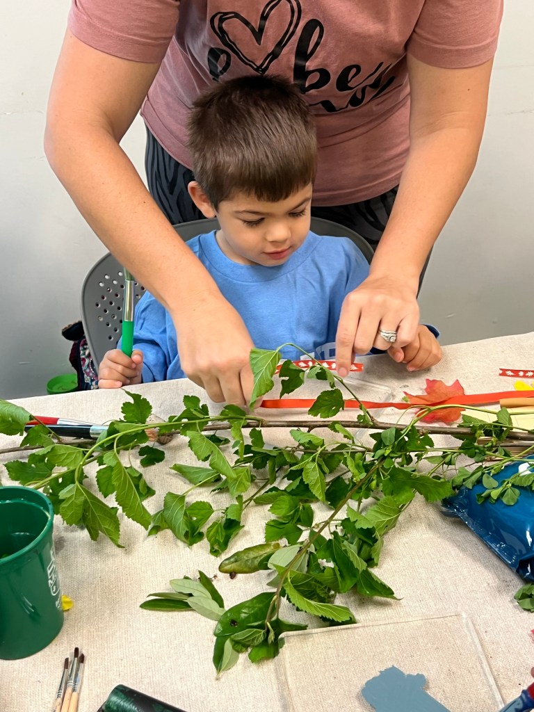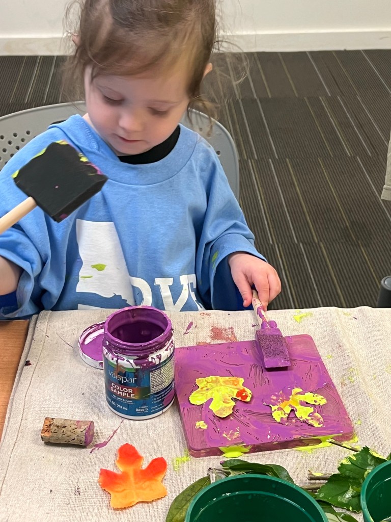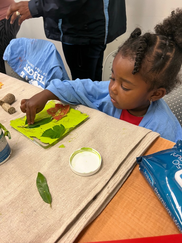 The last session of Budding Artists arts and literacy program at the library marked a memorable culmination of creativity and learning for children ages 2-5 and their caregivers. This week’s nature-based enrichment workshop focused on printmaking, using natural and recycled materials to spark imagination and practice sustainable art making.