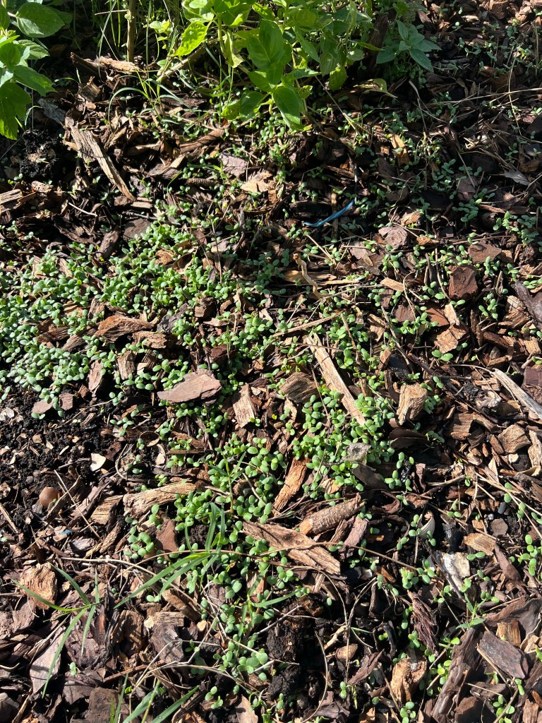 We did some weeding and cast seeds in three beds to replenish the soil that has previously been growing our tomatoes, a nitrogen depleting crop. After planting the Crimson Clover we added a thin layer of mulch to retain moisture but allow for enough sunlight to encourage seed germination. With the aid of several rainy days, in just under a week the seeds sprouted.