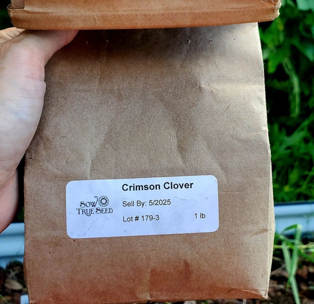 We sowed Crimson Clover, a versatile legume cover crop for our climate zone and excellent nitrogen producer for our raised beds.