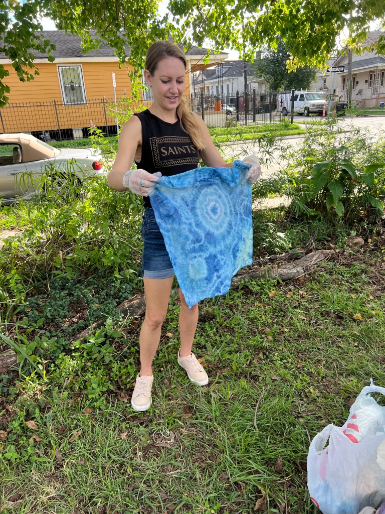 Attendees gathered, eager to dive into the artistic process at Galvez Garden. Lilith began by introducing the fascinating history and techniques of natural indigo dyeing, explaining how this ancient practice has been used across cultures for centuries, and its specific relationship with Louisiana and our relationship with France. Participants learned about the indigo plant, its significance, and the process of creating dye from its leaves. The air was filled with optimism as everyone prepared to bring their own fabric to life with rich, blue hues.