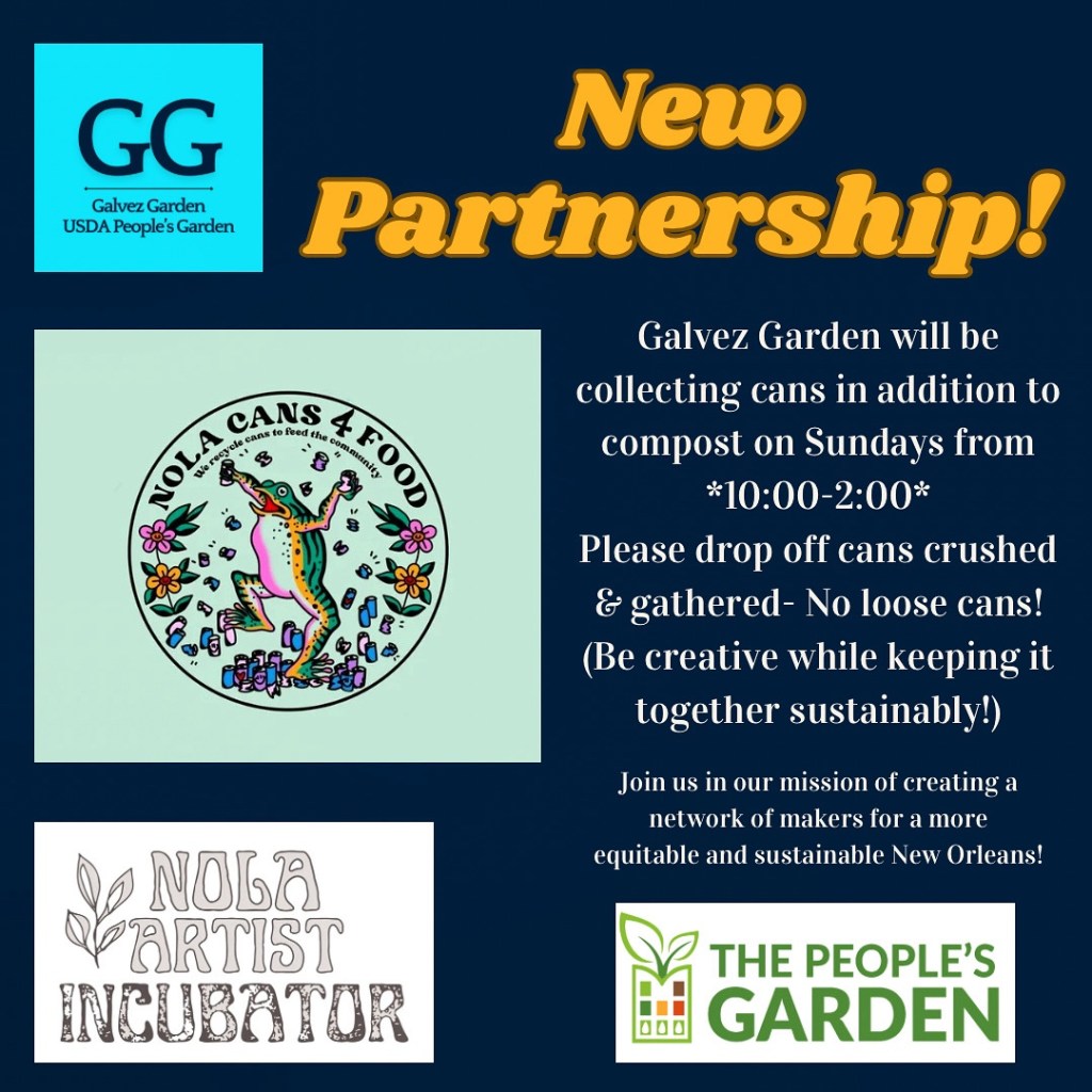 Galvez Garden is proud to announce the expansion of its sustainability efforts with the introduction of a new partnership with NOLA Cans 4 Food. This exciting initiative will complement our ongoing collaboration with Compost NOW, in which the Incubator has successfully composted over 20,000 pounds of food waste from our landfills.