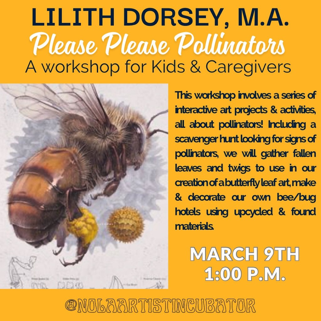 Workshop for kids exploring pollinators! Join us as Lilith Dorsey leads us in their final workshop as Galvez Garden’s Artist-in-Resident!