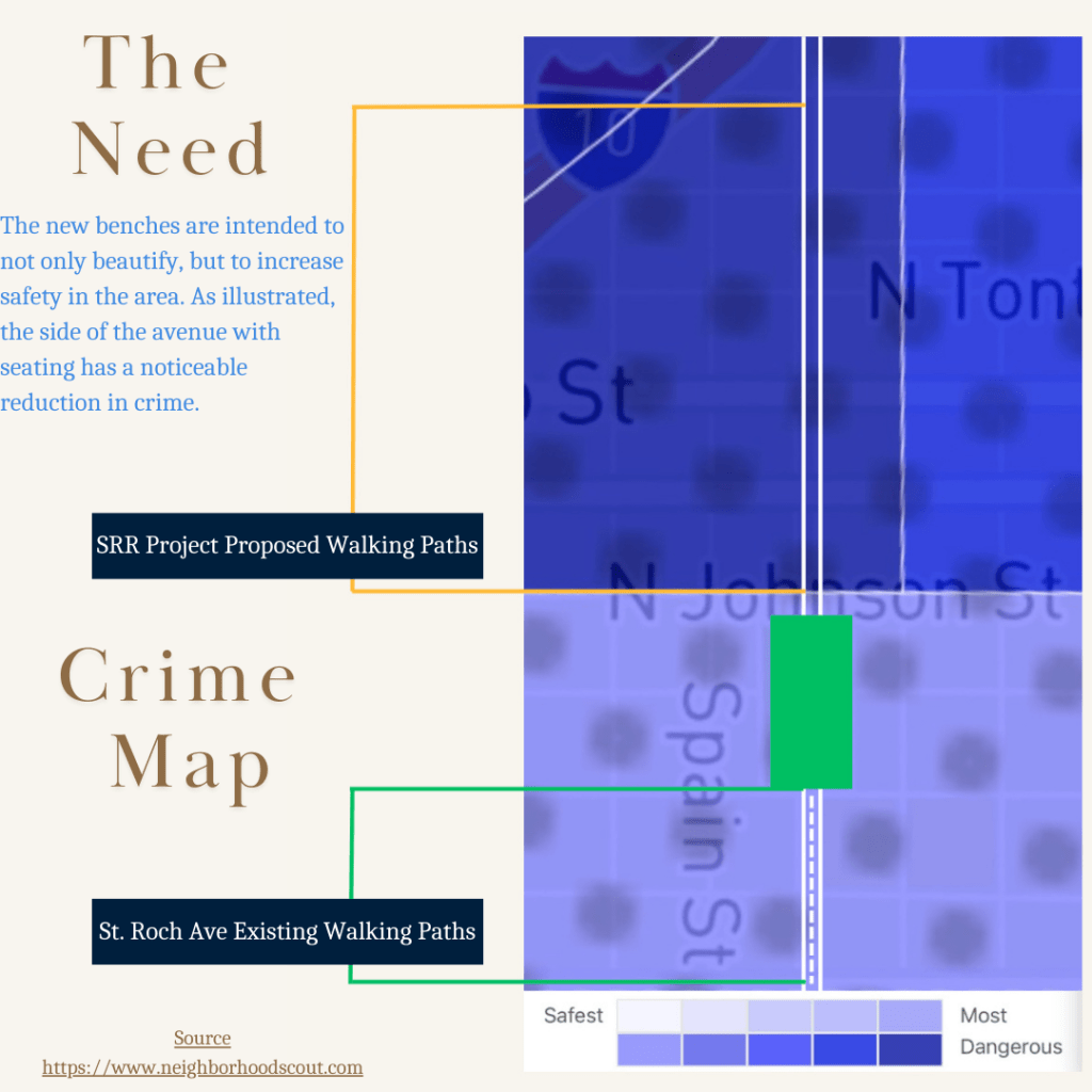 When looking at the crime map of this area in the neighborhood of St. Roch, there is a notable increase in crime in the area surrounding St. Roch Avenue that does not have established beautification projects on the neutral ground. By comparison, the safest areas are those with plantings, walking paths, lighting, and benches. The neighborhood is divided by districts, and just past the park, District D of St. Roch is neglected.