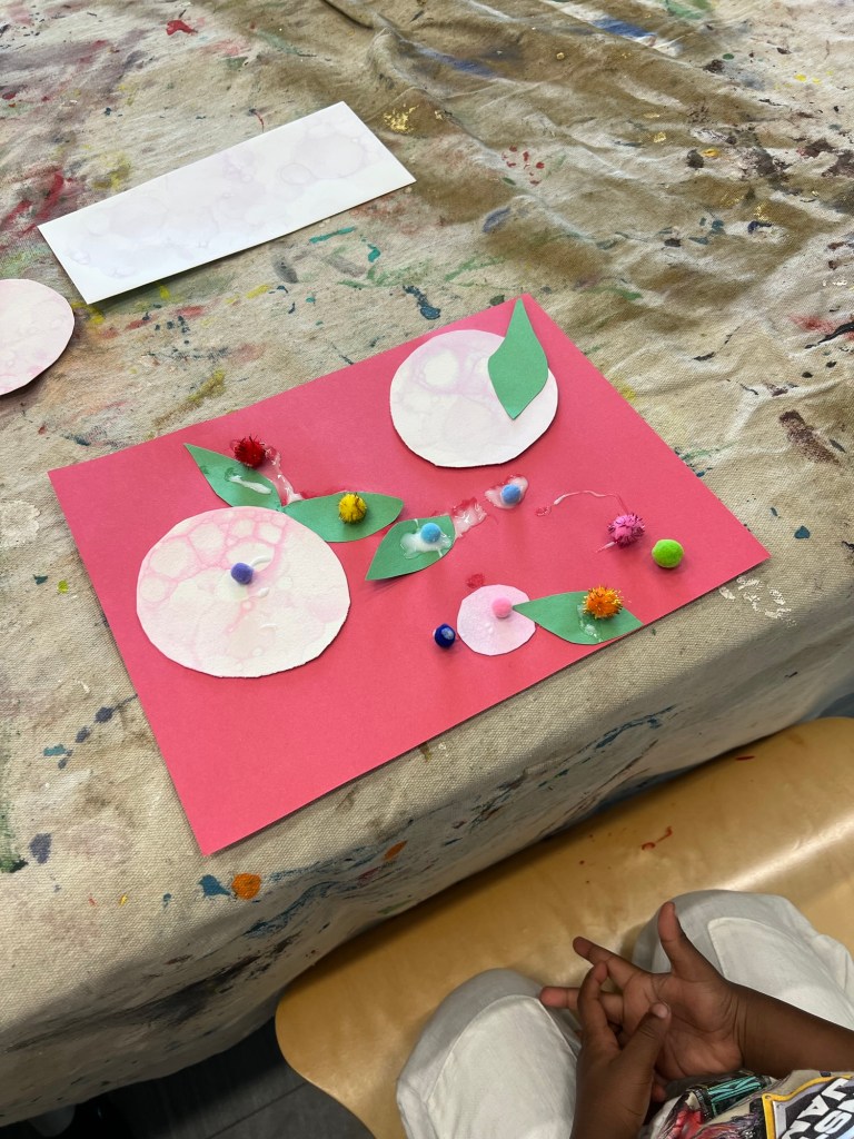 Children were given glue, paper leaves, pom-poms, and colored paper to layout the dyed paper however they wanted. This is when the young artists could really express their creativity. It was wonderful to witness the unique works take shape and no two images were the same!