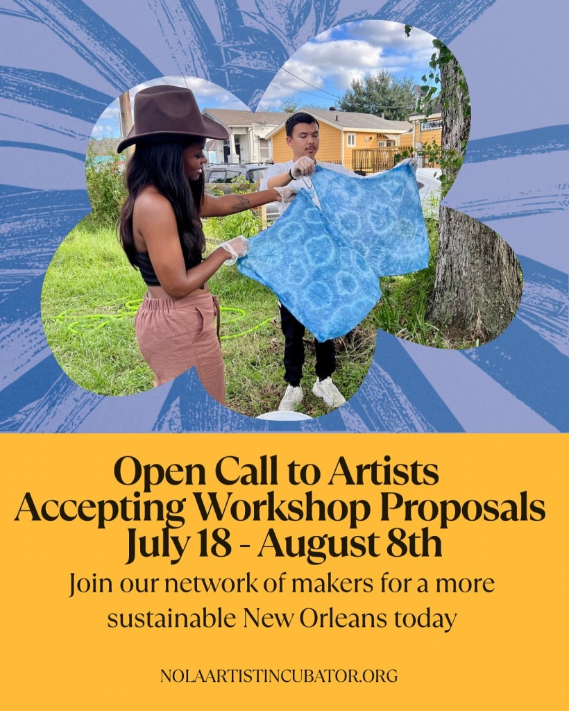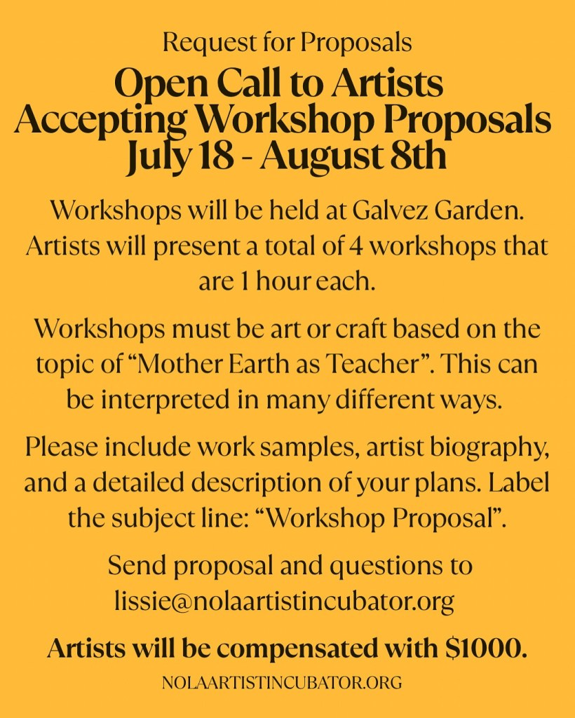 The NOLA Artist Incubator is pleased to announce our Request for Proposals period is open. We are looking forward our next Artist-in-Resident! We want you to share your art with the community by hosting workshops at Galvez Garden.