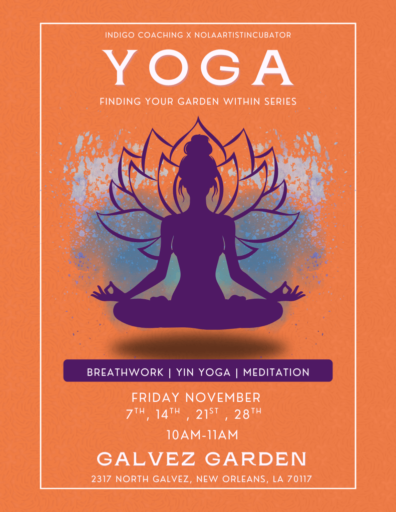 In Partnership with Indigo Coaching, Dr. Bethany Moore will be delivering yoga, meditation, and breath work classes at Galvez Garden. Classes will be held on Fridays in November from 10am-11am.