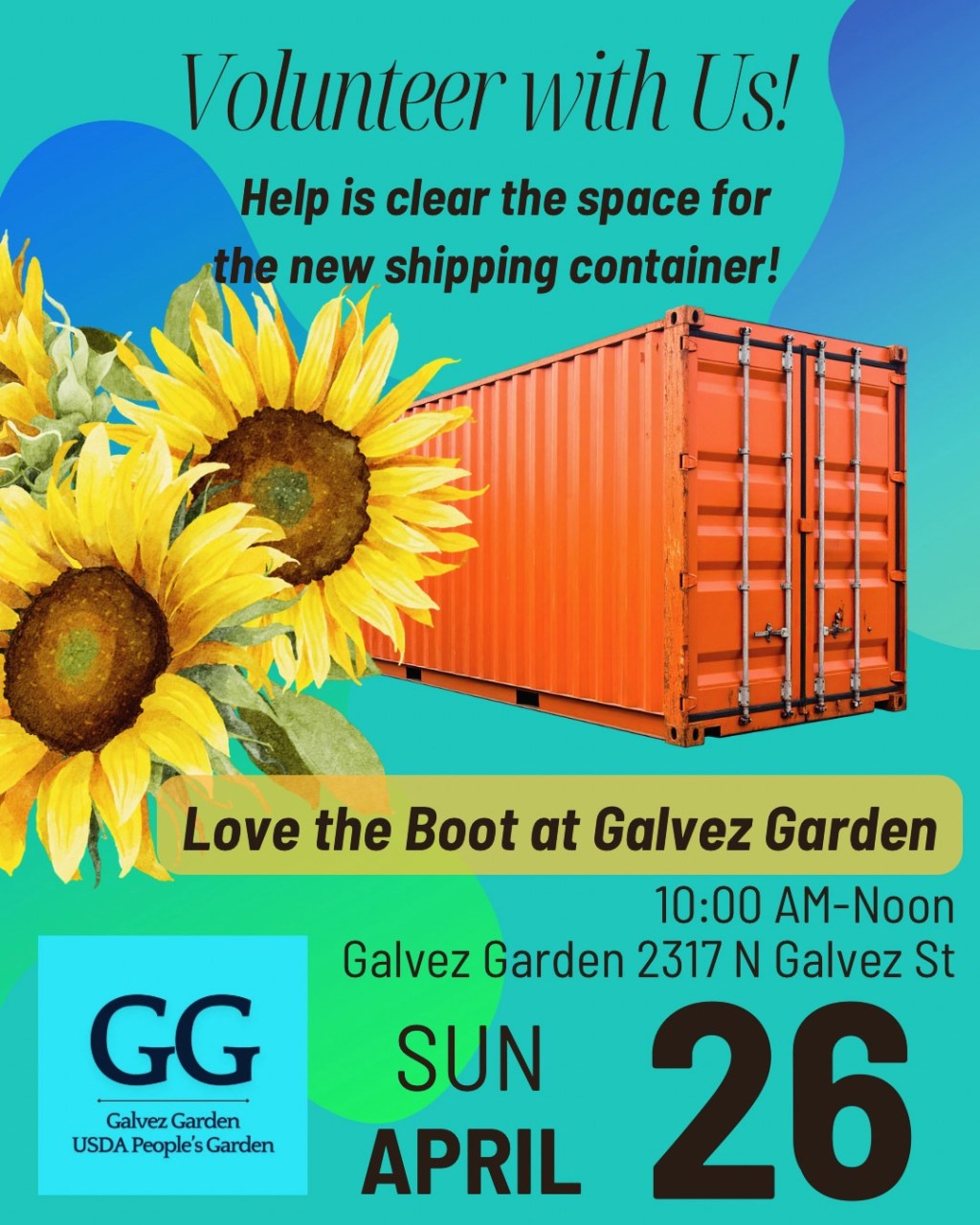 Volunteers are welcomed to join us in preparing the site at our 5th Annual Love the Boot at Galvez Garden event, this Sunday from 10:00 to noon. Hope to see you there!