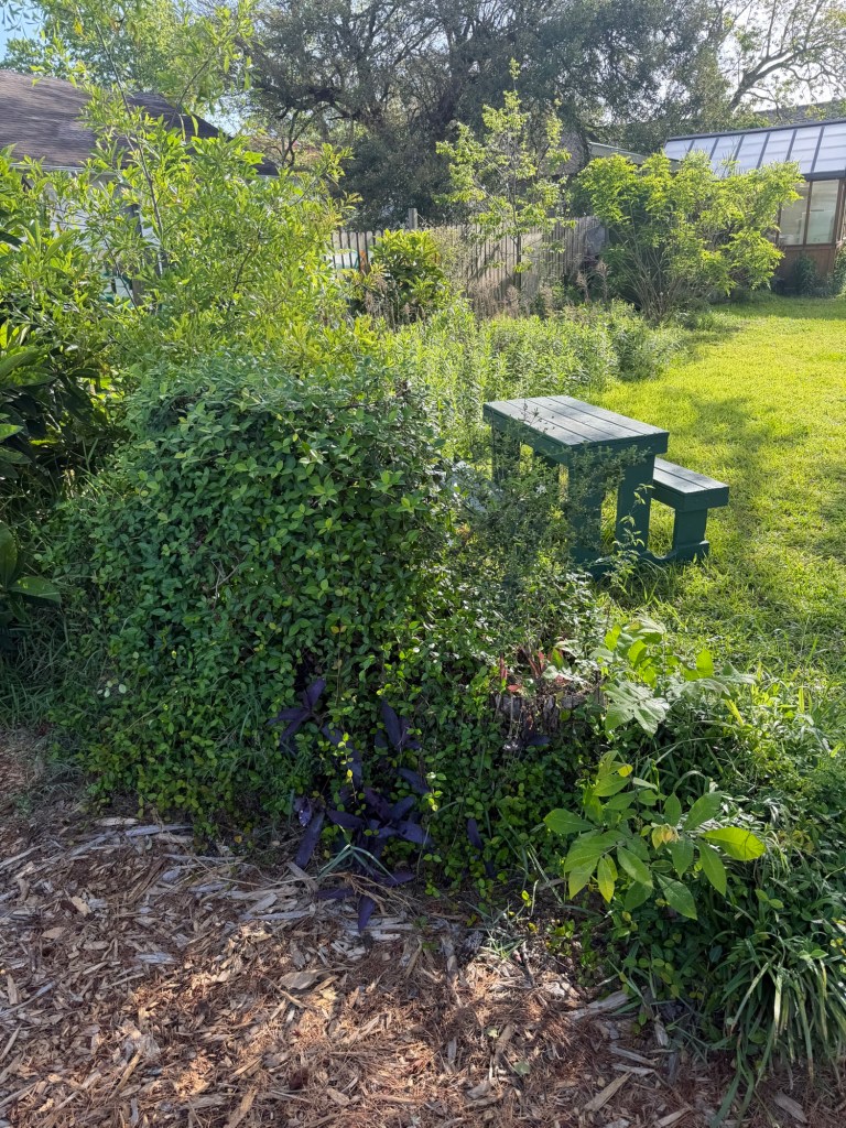 Currently the location where the shipping container will be located has approximately 30 cubic yards of mulch, some vegetation, and our original sculpture, the Galvez Garden Community Shrine, created by Anna K. Lemnitzer. Much work will go into making the site ready for the new addition.