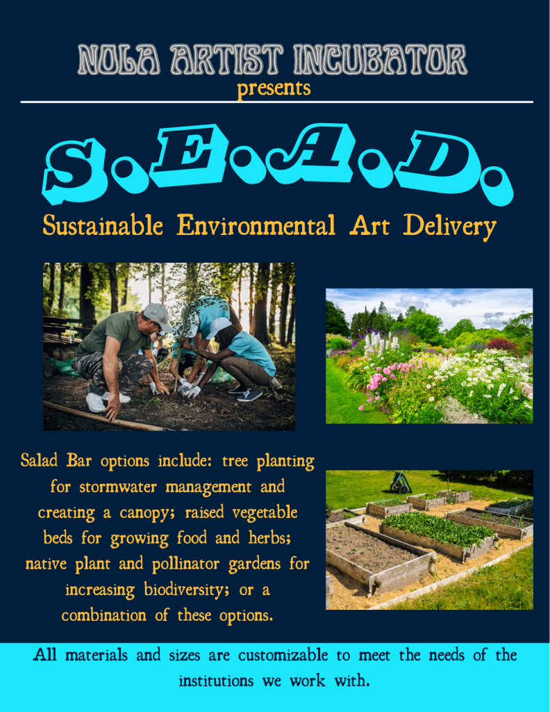 NOLA Artist Incubator provides education that is inspired by issues surrounding our environment through our regenerative agriculture initiatives, sustainable art programming, and early education arts and literacy program. The Incubator examines areas of food sovereignty, regenerative urban agriculture, and environmental justice. Hosting field trips, site visits, alternative spring breaks, and engaging learning opportunities through restorative beautification projects, we serve a range of individuals locally and nationally.