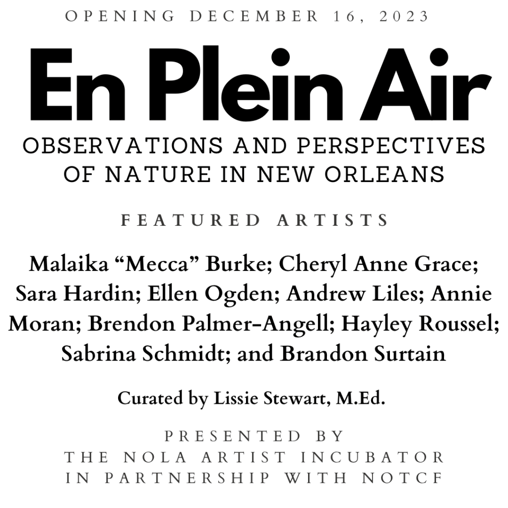 1 day, 10 artists, 10 works. In 2023 we produced a one day public art event at the Louisiana Audubon Nature Center. Concluding the event, in 2023 the NOLA Artist Incubator exhibited, “En Plein Air: Observation and Perspectives of Nature in New Orleans”. This public art exhibition used art to interpret ideas and concepts reflecting changing environments specific to Southeastern Louisiana.