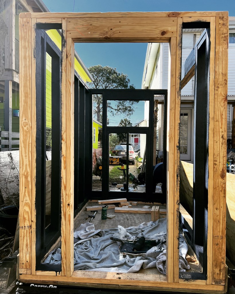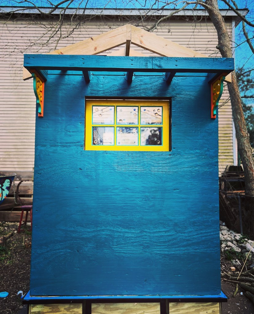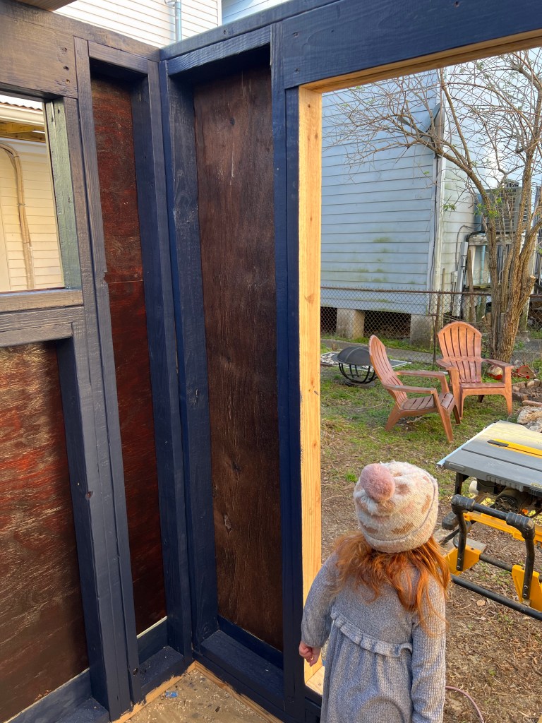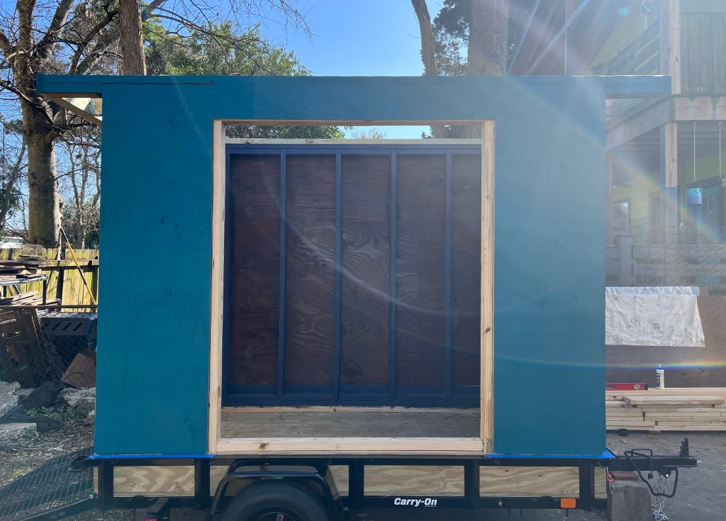 One more wall up in the Magical Mobile Art Cart! This one is framed for a recycled window to go into the wall. Also, today we added some interior paint. Building is ahead of schedule and we couldn’t be happier!