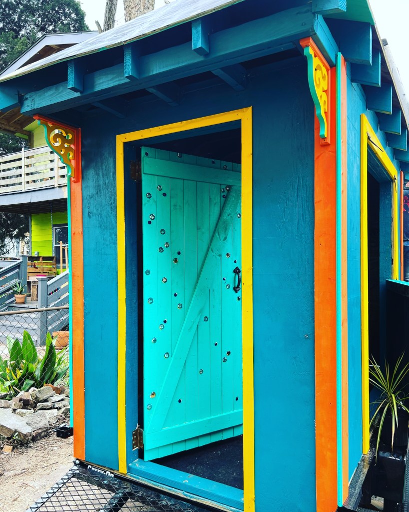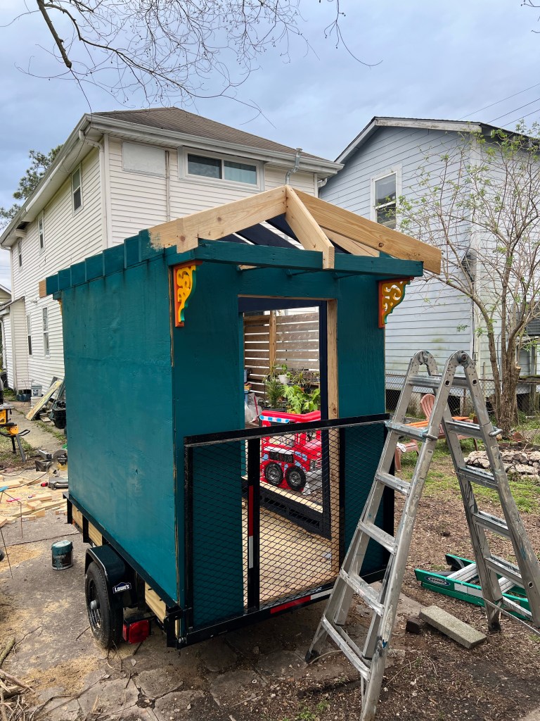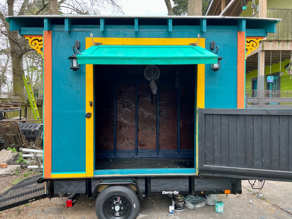 The early shotguns generally had hipped roofs on the front and rear, or had hipped front and gabled rear. They were built close to the ground and abutting the sidewalk, with a shallow roof overhang in the front. This was an essential feature for the building’s construction in order to include elaborate brackets and corbels into the design. Though the least aerodynamic roof design for a traveling workshop, this roof is so iconic it was decided early in the design process to be the best aesthetic choice for the build. Careful consideration towards addressing the structural integrity was important to keep the structure strong enough to withstand the impact of wind while traveling. As such, the decision to include a hip roof on both sides of the Magical Mobile Art Cart was made to both pay homage to the architecture distinctive to New Orleans, while building the most aerodynamic design for the purpose of the installation.