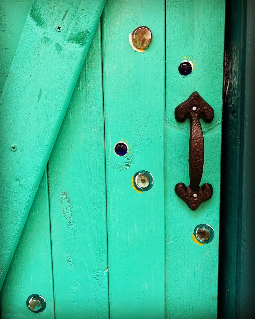 We also made the front door. We used furring strips and some leftover wood, painted it, and I promptly got to work. This is one of the design elements that I was excited most about conveying a whimsical and magical feeling. I took many drill bits to the the door, trying hard to not create a clear pattern, and burrowed in holes. The holes go all the way through so on the back, black painted side, there are tiny pinpricks for light to enter. Then I secured marbles into the notches and we hung the door. Here’s a glimpse of that process in the image below.