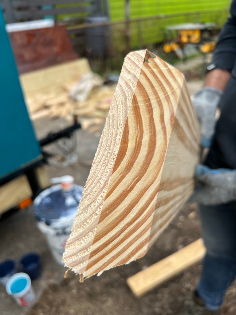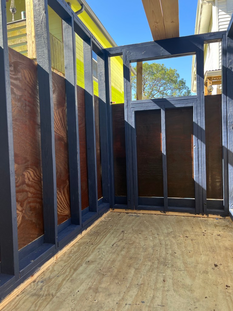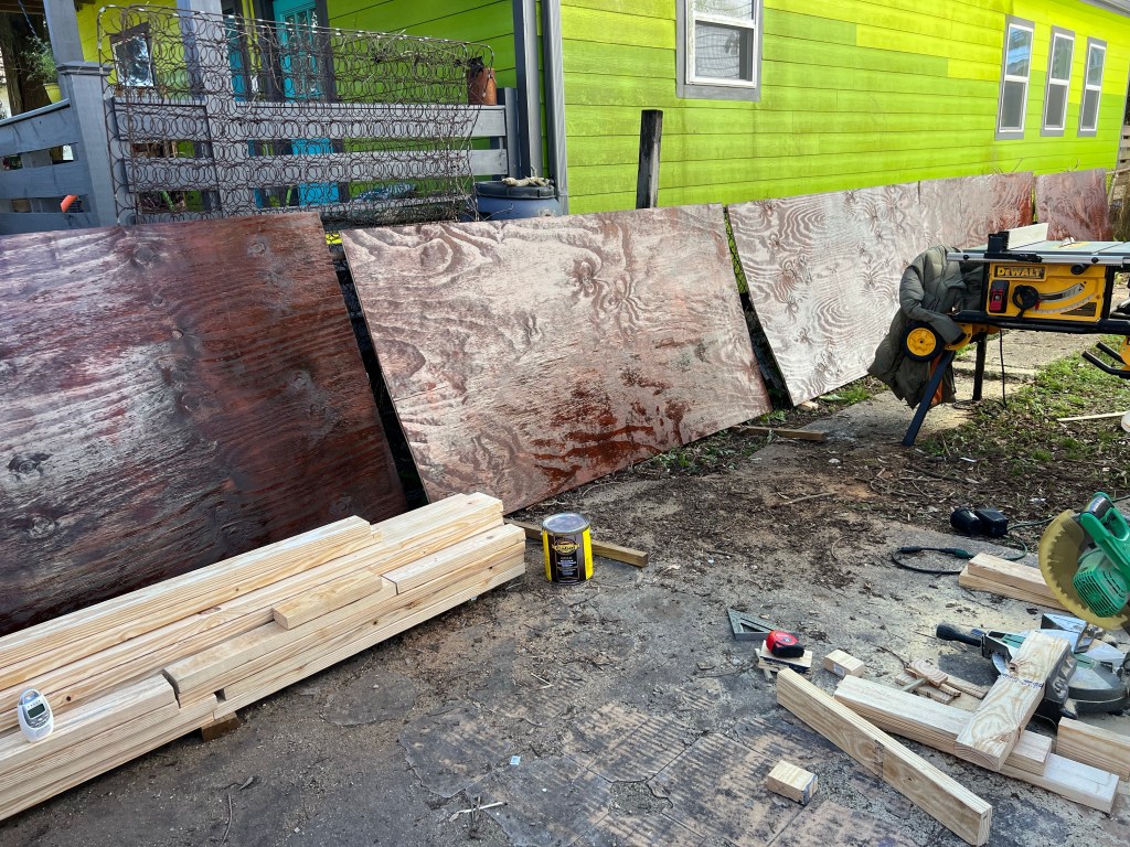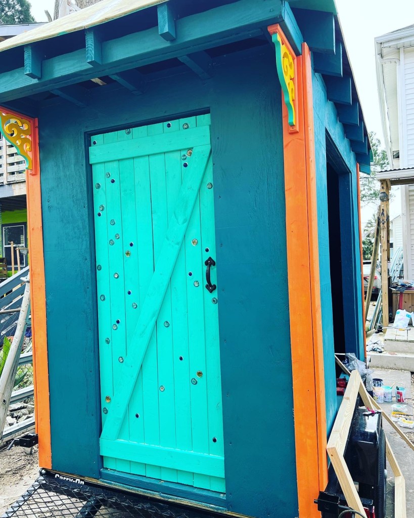 Despite two days of rain we managed to complete the rafters for the hip roof, saw, paint, and hang trim. It’s feeling like a little house. The painting as we go philosophy is paying off (and saving time and money, eliminating the need for painters tape). We got the pressure treated plywood up just before the rain came. Here’s a glimpse of hard working making magic. Oh, and we have been skipping Mardi Gras parades in order to work on the build. When you’re making something magical, sacrifices must be made. We will be taking time off tomorrow.