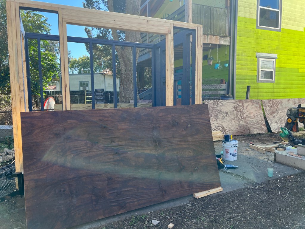The Magical Mobile Art Cart has four walls! Today we got the wall for our doorway framed, finished painting the interior, and stained the remaining plywood for the walls and ceiling. Check out our progress!