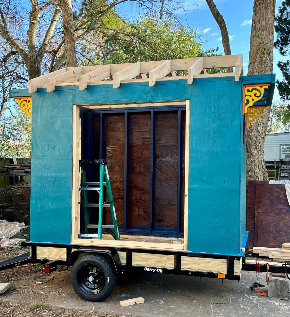 Hip rafters in place! The Magical Mobile Art Cart got some more painting (the painting is ongoing and tedious) and all the trim boards have been painted (twice) to prepare for installation. Making record time, we’re delighted to share our progress.