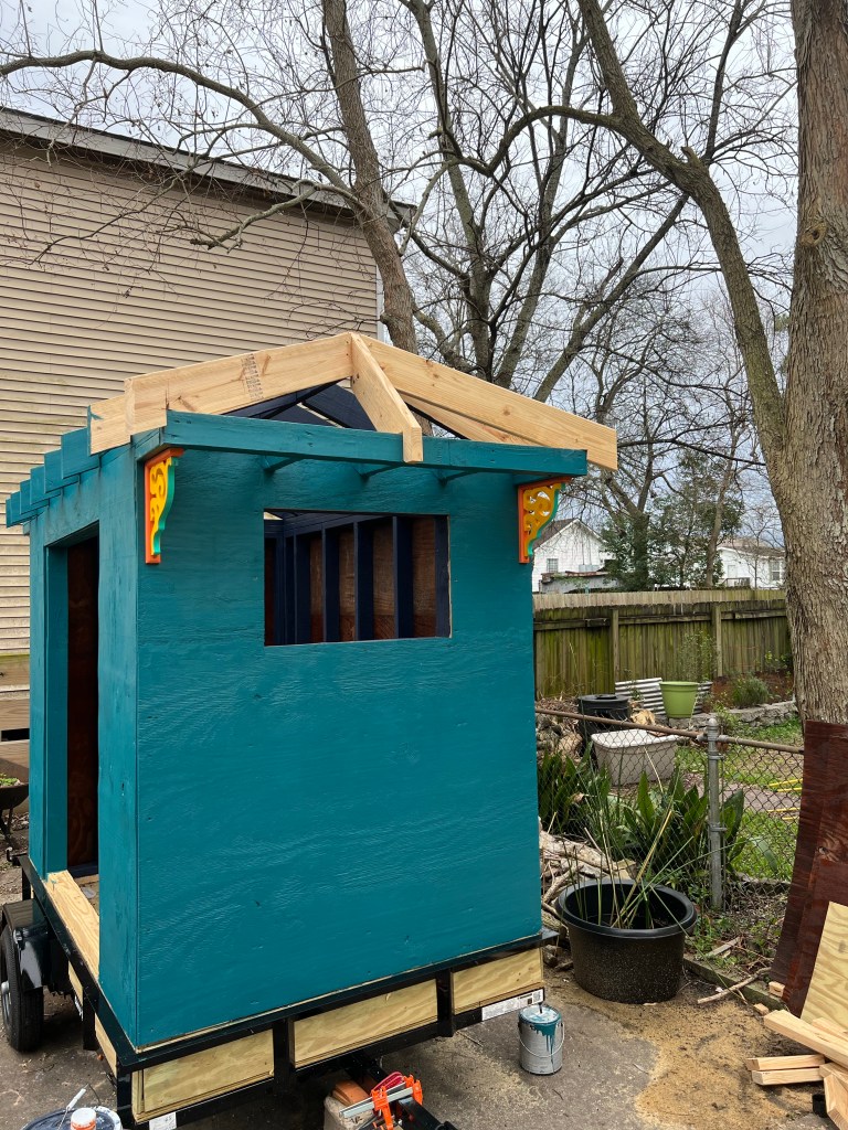 Today we added the common rafters for the gable roof. More painting was done and the window is finished. We hung the elaborate hangers and the cart is starting feel pretty magical to us.